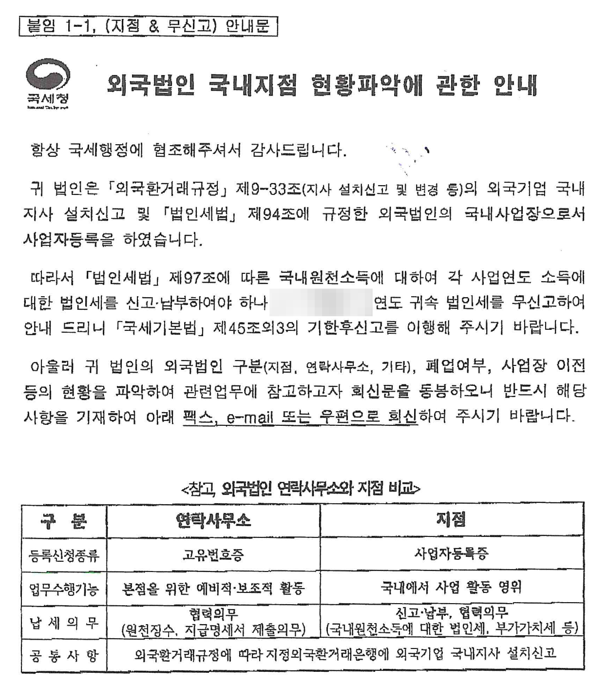 최근 국세청에서는 국내에 지점(Branch Office) 또는 연락사무소(Liaison Office)를 둔 외국법인을 대상으로 ‘국내지점 현황파악 안내문’을 발송하고 있습니다.