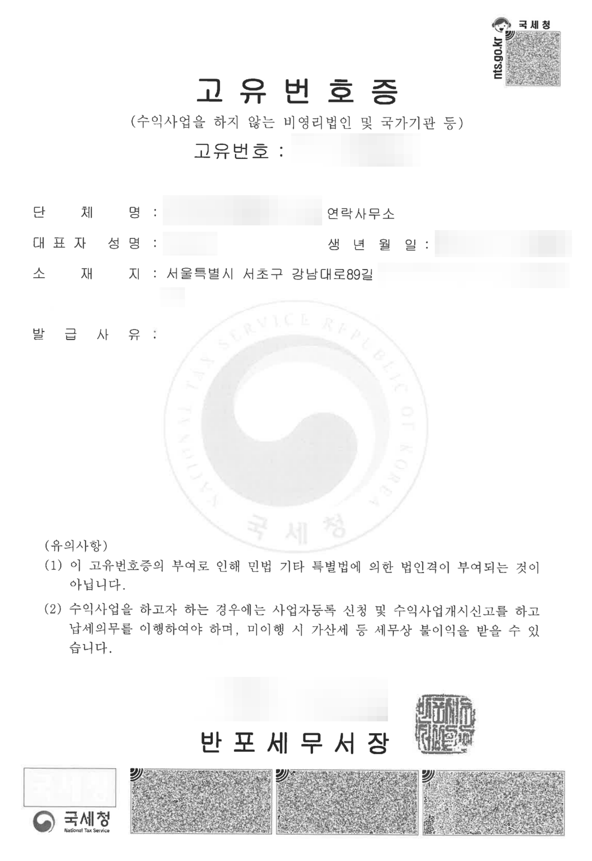 - 세무서 등록 (고유번호증 발급): 관할 세무서에 신고필증과 준비 서류를 제출하면, 연락사무소의 신분증인 고유번호증이 발급됩니다.
